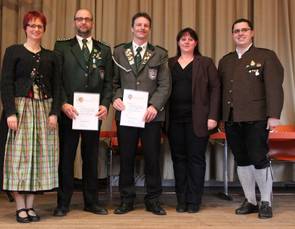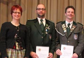 Mit dem silbernen Ehrenzeichen der Bayer.Schützenjugend wurden von 1.BJlin Ute Back der langjährige Gaujugendleiter Achim Krämer, Kitzingen und der 3.BJL Uli Ebert ausgezeichnet. (Foto2: v.l.1.Blin Back, 3.BJL Ebert, Achim Kärmer, KT)