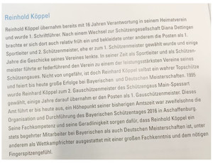 Für sein beachtliches Engagement um den unterfränkischen Schießsport bedankt sich auch der Schützenbezirk Unterfranken und gratuliert dem 1. Gauschützenmeister Reinhold Köppel ganz herzlich zu dieser ganz besondere Auszeichnung, die er sich redlich verdient hat.