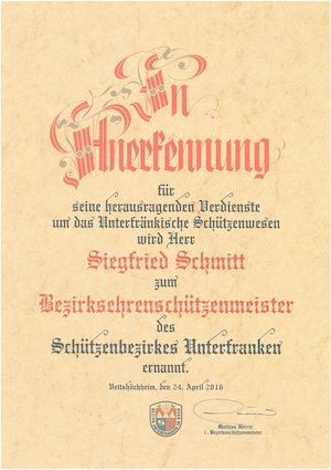 Ehrenurkunde / Verleihung im Rahmen des 64. Bezirksschützentages am 24. April 2016 in Veitshöchheim.