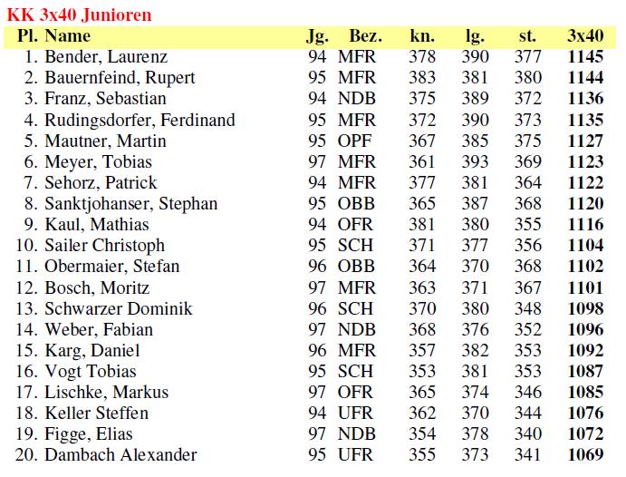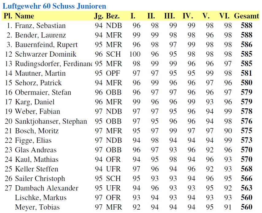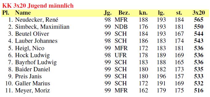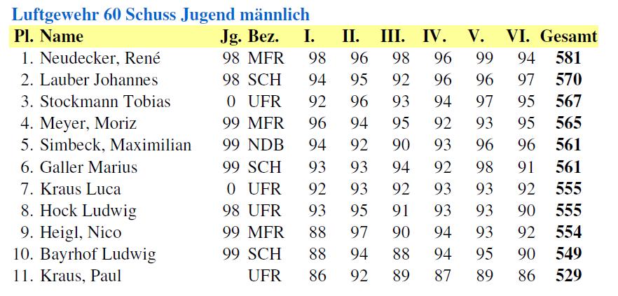 Der Bezirk Unterfranken war mit den Schützen Tobias Stockmann (Kleinrinderfeld), Luca Kraus (Sulzbach), Antonia Back (Schimborn), Anna-Lena Albert (Vormwald), Ludwig Hock (Haibach) und Sara Lechner (Röttingen) am Start und belegte mit 3401 Ringen den 6. Platz.
