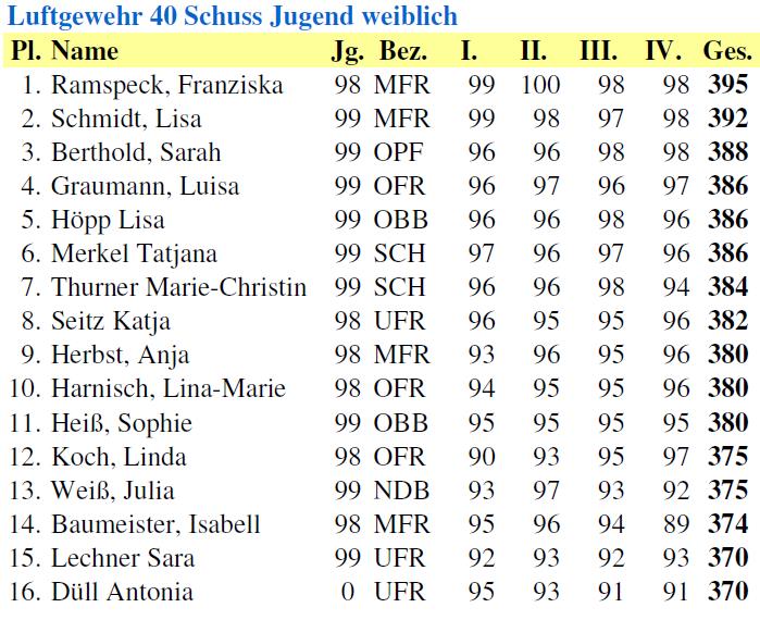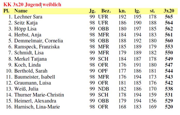 Beste Einzelschützin in der Gesamtwertung Schülerklasse wurde mit einem sehr guten Ergebnis von 585 Ringen und neuer persönlichen Bestleistung Antonia Back. In der Jugendklasse wurde Sara Lechner mit guten 581 Ringen beste Schützin des Bezirkes.